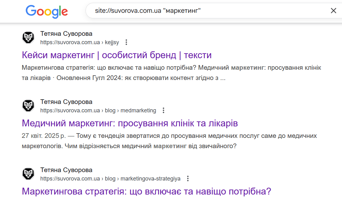 Покаже, які сторінки сайта є з потрібним вам запитом.